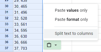 1. comma로 구분되어있는 값을 google spreadsheet에 붙여넣는다