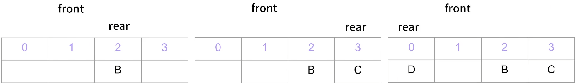 위 규칙을 적용하고 capacity -1 개의 저장공간만 사용한다(front가 가리키는 곳은 항상 비어있다)