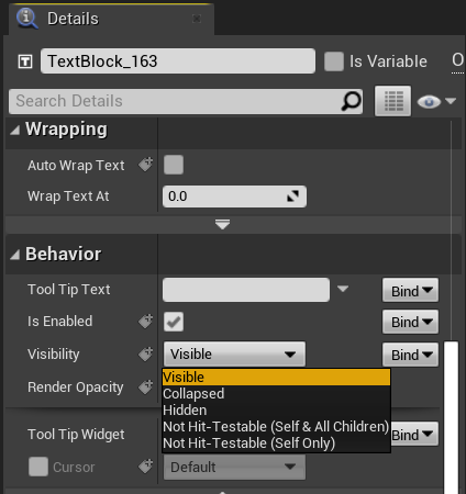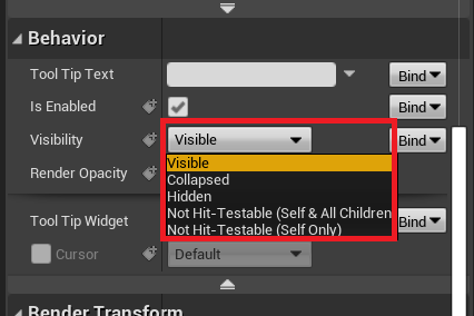 visible을 사용하기 보다 [ HittestInvisible, SelfHittestInvisible ]를 활용하자. 뒤에 소개한 변수는 유저가 클릭할 수 있는 인터페이스를 만들지 않는다. Self는 자신만, Hit은 하위에 있는 요소에도 적용된다.