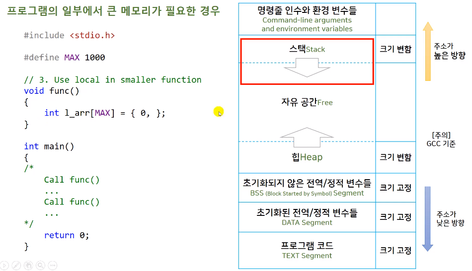 지역변수는 Stack에서 관리된다. Stack은 필요한 메모리만큼 저장공간을 늘릴 수 있다. 지역변수 l_arr[MAX]는 컴파일 시점에 저장공간이 정해져있다. OS의 도움을 받지 않고도 메모리를 활용할 수 있기 때문에 메모리 관리를 빠르게 할 수 있다.
