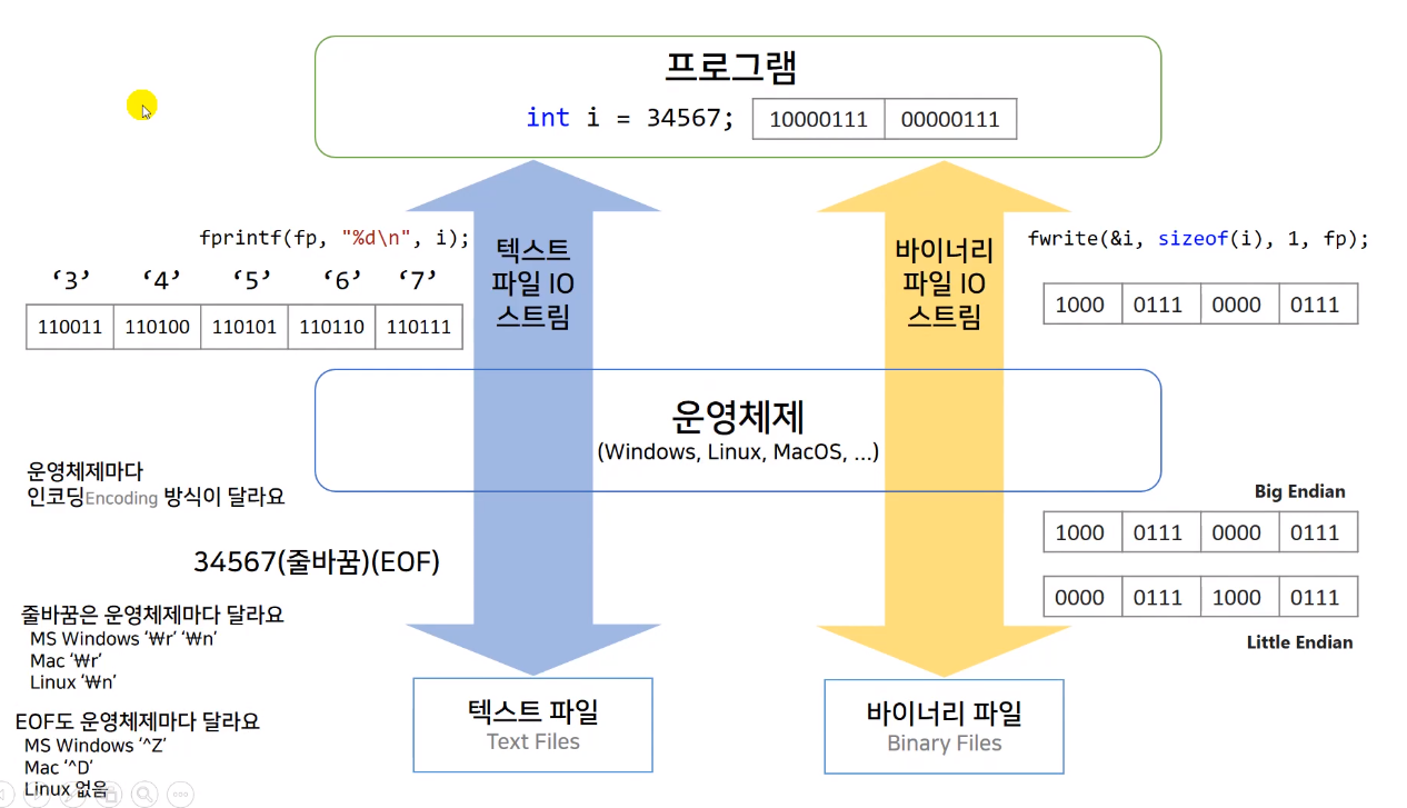 windows는 EOF에 별도표시를 하기위해 한 글자를 추가한다. Linux는 하지 않는다. 줄바꿈기호, 시작지점 기호는 운영체제마다 다르다. 텍스트 파일을 저장할 때는 운영체제가 추가적인 작업을 하기 때문에 텍스트 파일의 입출력은 운영체제마다 다르게 나타난다.