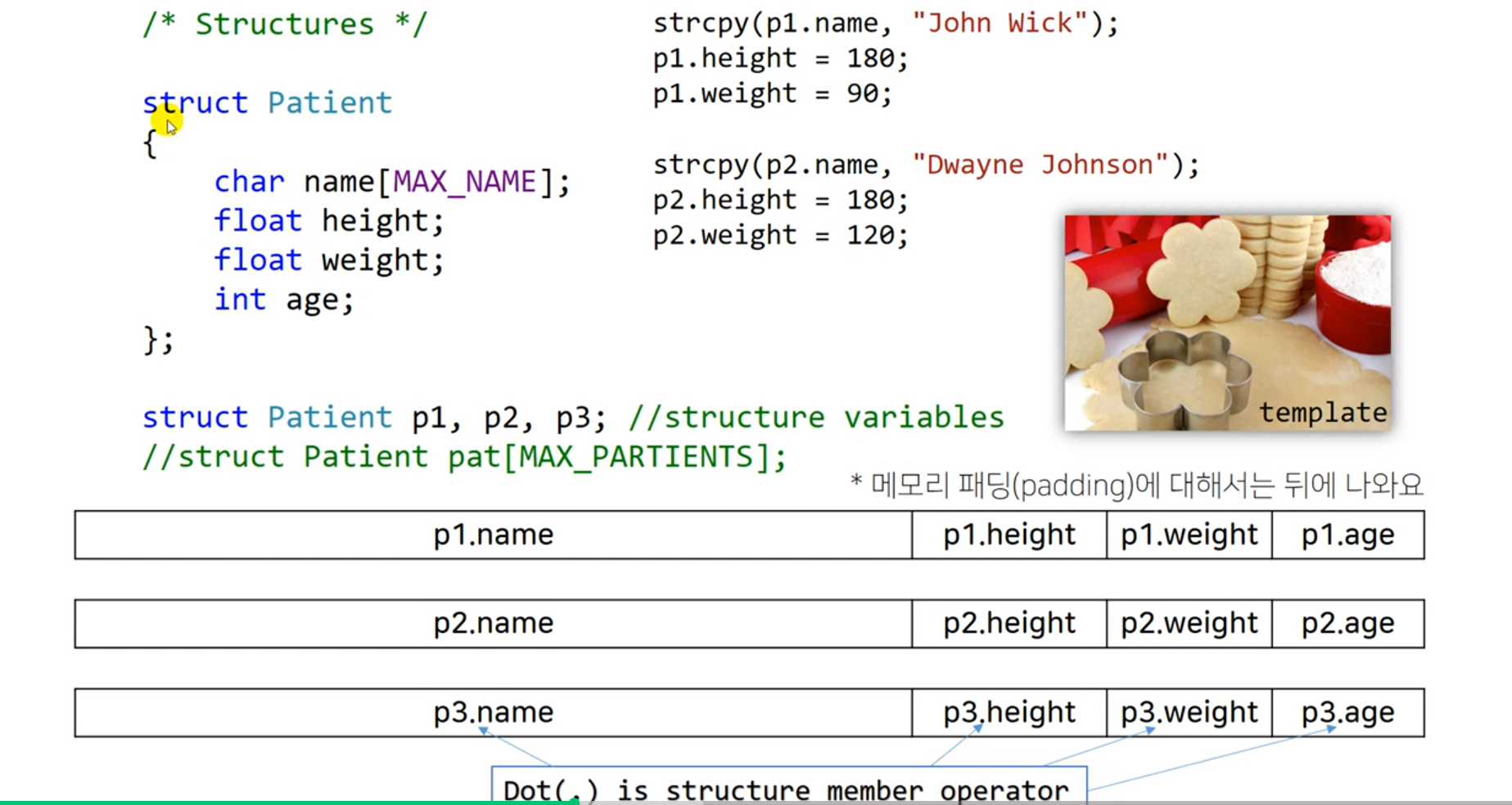- 메모리를 효율적으로 사용하기 위해 멤버 member variable 사이에 빈공간(padding)을 둔다.
